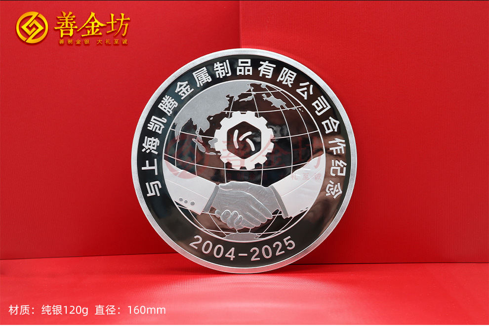 每一份长久的合作,都值得被郑重铭记;每一段携手的岁月,都需要有质感的载体来镌刻。上海善金坊深耕贵金属定制领域,以精湛工艺为笔、以纯银为纸,为上海凯腾金属制品有限公司量身打造了一款极具纪念意义与收藏价值的纯银纪念章,将二十一年风雨同舟的合作情谊永久定格。