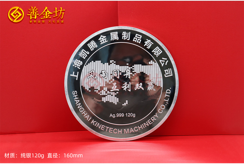 在品质把控上,善金坊始终坚守匠心标准,让每一件定制作品都经得起时间的检验。这款纪念章采用大尺寸设计,直径达160mm,视觉冲击力十足。材质上选用纯度高达99.9%的纯银,严格把控含银量,确保每一枚纪念章的纯银重量精准达到120克,背面清晰标注的“Ag.999 120g”字样,既是品质的承诺,也是价值的彰显。从原料甄选到成品打磨,善金坊遵循严苛的制作流程,经过多道精密工序加工,最终呈现出成色标准、重量合格、质感细腻的精制品质,每一处纹路都清晰流畅,每一个字样都规整有力,尽显匠心工艺。